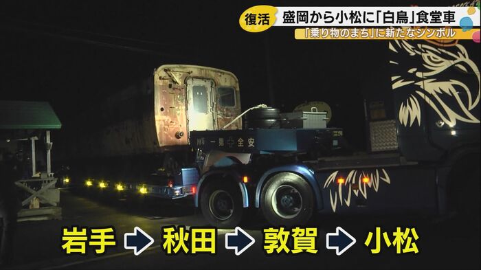 吊り上げられた車体はトレーラーの荷台に収められ、午後9時、食堂車を乗せたトレーラーは秋田港へと向かった。そこからフェリーで福井県敦賀港へ渡り、12月12日の午前、岩谷さんが管理する小松市の土地に到着した。
