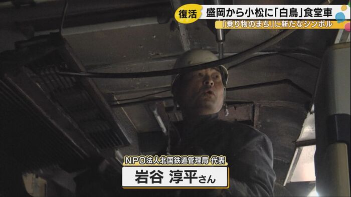 この食堂車の原型を作ったのは、実は日本のホテル王とも呼ばれた帝国ホテル社長の犬丸徹三さんと言われている。犬丸さんは小松市の隣、能美市の出身であり、そんなゆかりもあって岩谷さんは食堂車の復活を自分の使命だと感じているという。今回、食堂車の修繕を小松で他の鉄道愛好家と共に行う予定で、技術の承継も目指している。