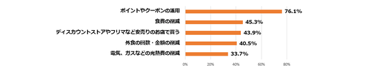 自身の物価高対策の上位はポイント活用、食費減、安売り店利用