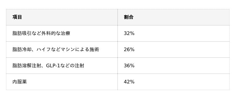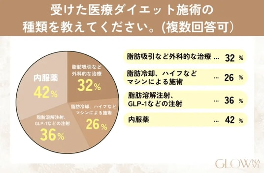 受けた医療ダイエット施術の種類の回答で最も多かったのは、「内服薬」で42%に達しました。