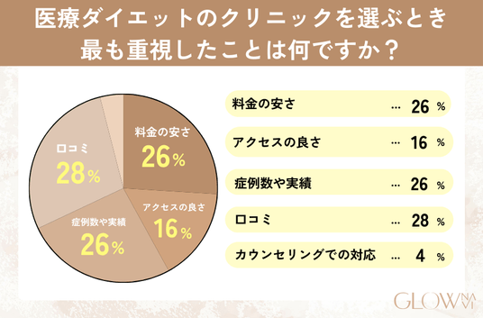 - クリニック選びの際に最も重視したことについて、「口コミ」(28%)や「料金の安さ」(26%)、「症例数や実績」(26%)に回答が集まった