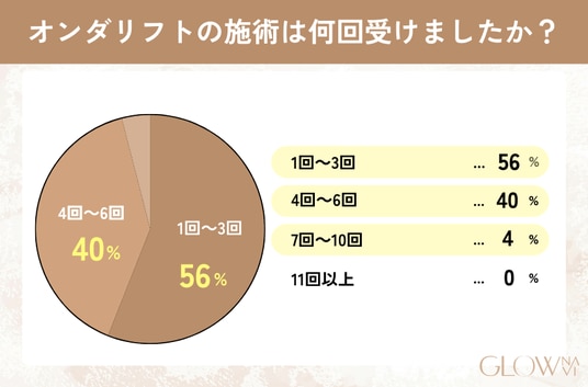 - オンダリフトの施術回数に関しては「1~3回」と回答した人が56%、「4~6回」が40%。