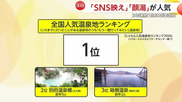 旅行サイト「じゃらん」が発表した「もう一度行きたい温泉地」の1位は、3年連続で群馬県・草津温泉となった。湯畑のライトアップや湯もみショーに加え、裏草津エリアや顔湯などSNS映えスポットが人気の理由だという。さらに若者向けに漫画堂やカフェも登場し、宿泊では飲食込みの「オール・インクルーシブ」プランが注目を集めている。