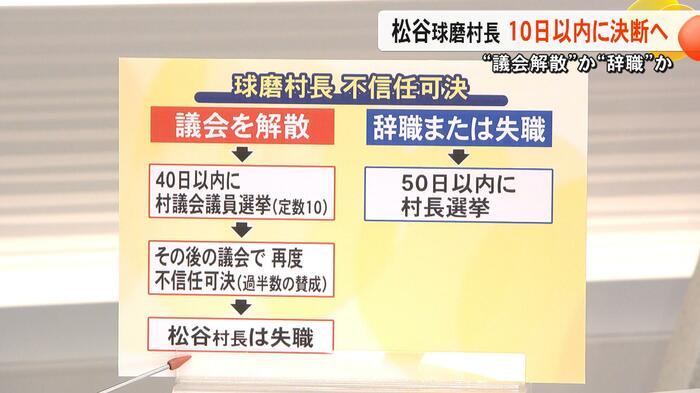 そして、議会の解散を選択した場合、40日以内に村議会議員選挙が行われる。その後の議会で過半数の議員の賛成で不信任案が再び可決されると、松谷村長は自動失職することになる。一方、辞職した場合は50日以内に村長選挙が行われる。