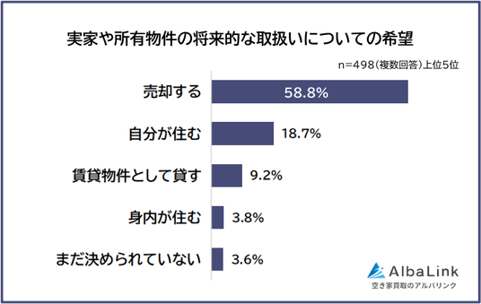 「実家や所有物件の将来的な取扱いについての希望」を聞いたところ、圧倒的1位は「売却する(58.8%)」でした。2位「自分が住む(18.7%)」、3位「賃貸物件として貸す(9.2%)」が続きます。
