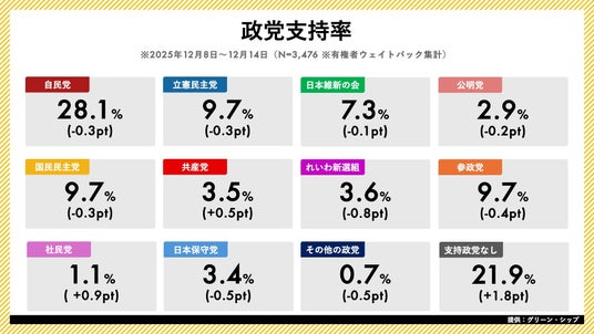 ジャッグジャパン株式会社(本社:東京都渋谷区)は、株式会社グリーン・シップ(本社:東京都千代田区)と業務提携し、グリーン・シップが提供する日次世論調査「世論レーダー」のデータを提供しております。本日、2025年12月第2週(12月8日~14日)の内閣支持率・政党支持率調査の結果を発表いたします。また、詳細レポートPDFを「世論レーダー」公式サイトの週次ページで1,980円(税込)で販売開始しました。