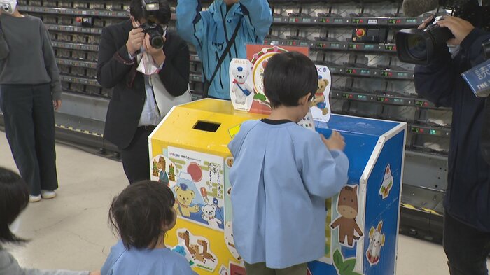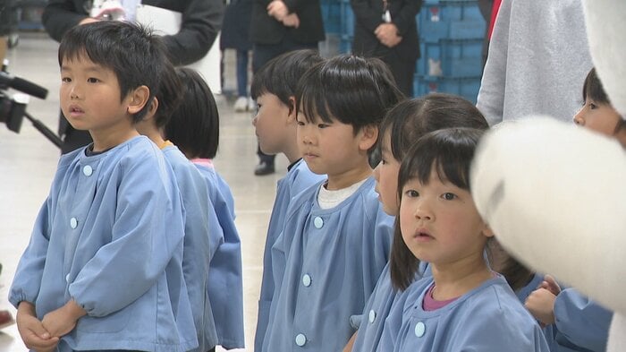 富山市の富山西郵便局で行われた式典には、地元の池多保育所の年少から年長までの 園児9人が招かれました。