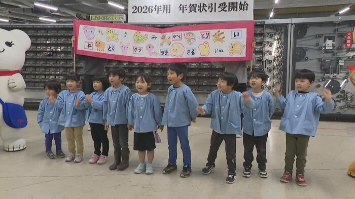 園児は歌や踊りを披露したあと、家族や友人に宛てて書いた年賀状を、ポストに一枚一枚投函しました。