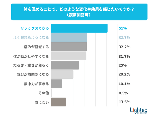 冷えを解消するために体を温めることで得たい効果として、「リラックスできる」(51%)が半数以上を占めました。次いで「よく眠れるようになる」(32.7%)、「痛みが軽減する」(32.2%)、「体が動かしやすくなる」(31.7%)といった回答が多く見られました。冷え対策には「身体的改善」だけでなく「リラックスや精神的安定」を求める人が多いことがわかります。