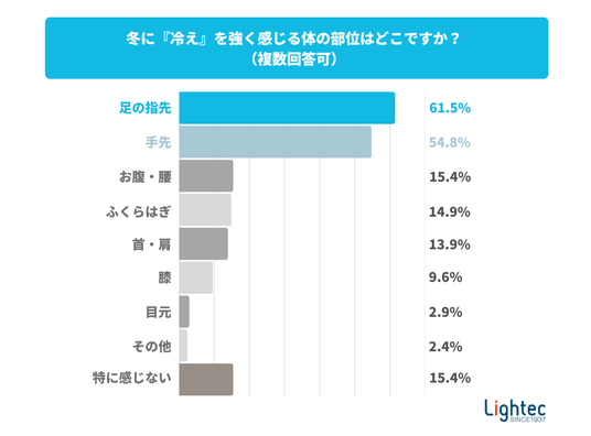 冬に冷えを感じると回答した人は84.6%に上りました。ほとんどの人が冷えの影響を受けていることが読み取れます。特に「足の指先」(61.5%)、「手先」(54.8%)といった末端部位に冷えを感じる人が多く、以降「ふくらはぎ」(14.9%)、「首・肩」(13.9%)、「お腹・腰」(15.4%)と続きます。