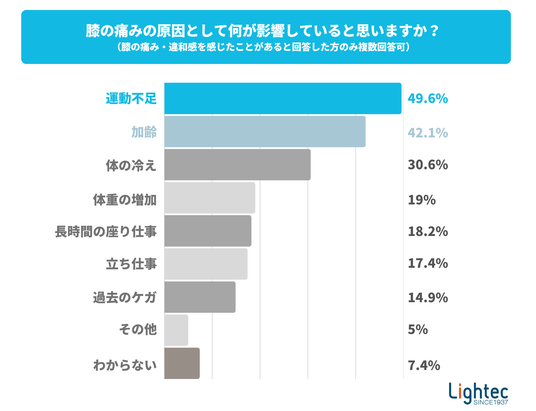 膝の痛み・違和感の原因としては「運動不足」(49.6%)の回答が最も多く、次いで「加齢」(42.1%)、「体の冷え」(30.6%)が挙げられました。特に運動不足は血流の低下につながり、結果として冷えを招きやすいことから、血流改善が痛みの緩和にも役立つ可能性が考えられます。