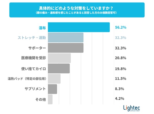 そこで具体的な対策を尋ねました。すると、「湿布」(56.2%)、「サポーター」、「ストレッチ・運動」(ともに32.3%)が上位を占めました。「医療機関を受診」(20.8%)する人も一定数おり、専門的なケアを必要とするケースも少なくないようです。また、「使い捨てカイロ」(19.8%)や「温熱パッド(特定部位用)」(11.5%)も活用されています。