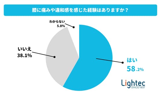 そこで、膝に痛みや違和感を感じた経験はあるか尋ねたところ、「はい」と回答した人は58.2%に及び、過半数以上が不調を経験していることが明らかになりました。