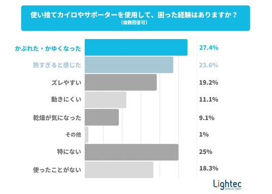 一方で、湿布や使い捨てカイロ、サポーターの使用経験がある人のうち、「かぶれた・かゆくなった」(27.4%)、「熱すぎると感じた」(23.6%)、「ズレやすい」(19.2%)といった不満が上位を占めました。これらの経験から、既存の温熱グッズに対する課題も読み取れました。