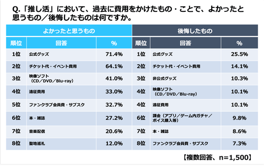 推し活において過去に費用をかけたもの・ことで「よかった」と思うもの、「後悔した(求めていた価値に対して赤字だったと感じた)」ものを聞くと、よかったものの上位は、1位「公式グッズ(71.4%)」、2位「チケット代・イベント費用(64.1%)」、3位「映像ソフト(CD/DVD/Blu-ray)(41.0%)」という結果になりました。