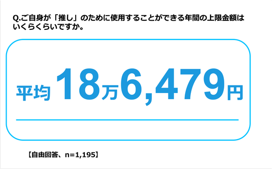 自身が推しのために使用することができる年間の上限金額を聞くと、全体では「年間18万6,479円」という結果になり、最大金額としては「500万円」という回答もありました。性別ごとに結果を見ると、男性平均が「年間22万6,489円」、女性平均が「年間14万6,133円」となり、個人が設定している上限金額として、男女間に8万円のギャップがあることがうかがえます。
