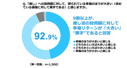 また、「公式グッズ」という、満足と不満足が共存する、ファンにとってよりシビアな投資への反応が明確になりながらも、推しへの投資額に対して得られている幸福(求めている価値に対してリターンがあるか)に関する質問では、全体の9割以上が「黒字」と考えていることがわかり、「推し活市場」が拡大し続けている要因がうかがえました。