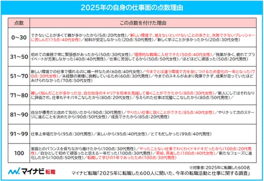 100点を付けた人の理由では「やったことのない仕事でわくわくドキドキだったから(20代男性)」「昇給、昇格した(40代女性)」「転職して学びの一年であったため(30代男性)」など、転職を通して新たな仕事に挑戦する様子や評価されたことで満足感を得ている様子がうかがえた。【図3、4】