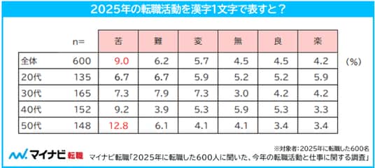 2025年に転職した正社員に、今年の転職活動を漢字1文字で表してもらったところ、「苦(9.0%)」が最多となり、「難(6.2%)」「変(5.7%)」と続いた。