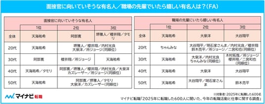 2025年の転職活動を経て、面接官に向いていそうな有名人と、職場の先輩でいたら嬉しい有名人を聞いたところ、共に1位は「天海祐希」が1位だった。年代別で見ると、「面接官に向いていそうな有名人」では20・40・50代は1位が「天海祐希」、30代は「阿部寛」が1位となった。