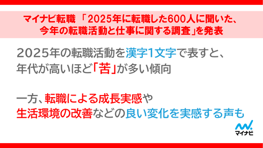 株式会社マイナビ(本社:東京都千代田区、代表取締役 社長執行役員:土屋芳明)が運営する総合転職情報サイト『マイナビ転職』(https://tenshoku.mynavi.jp/)は、「2025年に転職した600人に聞いた、今年の転職活動と仕事に関する調査」の結果を発表しました。
