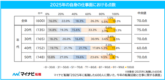 2025年の自身の仕事面を100点満点で表してもらったところ、全体の中央値は70.0点だった。