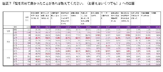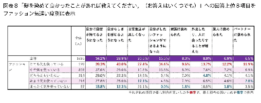 図表7では、項目ごとに男女それぞれで、最も割合が高い世代を赤字にしています。男性・30代では、髪を染めている人は少ないのですが(母数71のうち、14人)、多くの項目で男性・30代の割合が高くなっています。あまり染めている人がいないなかで、思い切って染めたからこそ、満足度が高くなっているのかもしれません。
