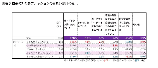 今回の調査では、見た目やファッションにどのくらい気を使っているかも聞いています(図表4)。ファッションの気遣い度別に、白髪の対処を見てみると(図表5)、気遣い度が高いほど、何らかの色に染めている割合が高く、気遣い度が低いほど「白髪染めせずに自然にまかせている」人の割合が高くなっています。