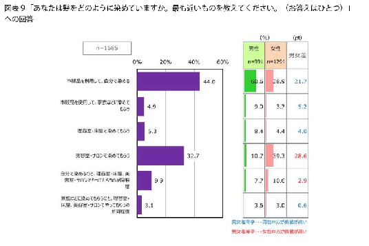 髪を染めている人に、どのように染めているのかを聞くと(図表9)、最も割合が高かったのは「市販品を利用して、自分で染める」(44.0%)でした。特に男性は60.6%で、ほかの項目と比べると断トツです。