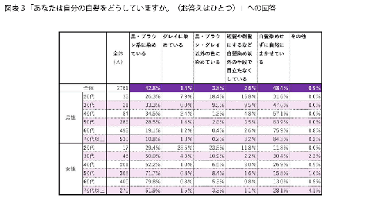 最も割合が高かったのが、「白髪染めせずに自然にまかせている」(48.4%)、次が「黒・ブラウン系に染めている」(42.8%)でしたが、性別や年齢によって対処は大きく異なるようです。