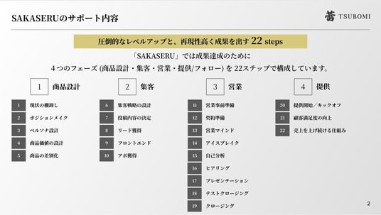「SAKASERU」は、商品設計・集客・営業・提供という4つのフェーズを、22のステップで体系化した事業立ち上げプログラムです。現状の棚卸しからポジションメイク、集客戦略、営業、提供体制の構築までを順序立てて進めることで、机上の計画ではなく、実際の顧客獲得・売上創出につながる設計になっている点が特徴です。