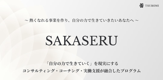 「SAKASERU」は、「自分の力で生きていきたい」個人が、ゼロから事業を立ち上げ、売上を積み上げていくプロセスをコンサルティング・コーチング・実働支援を組み合わせて一気通貫で支援する実践型プログラムです。