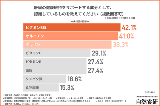 最後に、「肝臓の健康維持をサポートする成分として、認識しているもの」について尋ねたところ、『ビタミンB群(42.1%)』と回答した方が最も多く、『オルニチン(41.0%)』『タウリン(38.3%)』となりました。