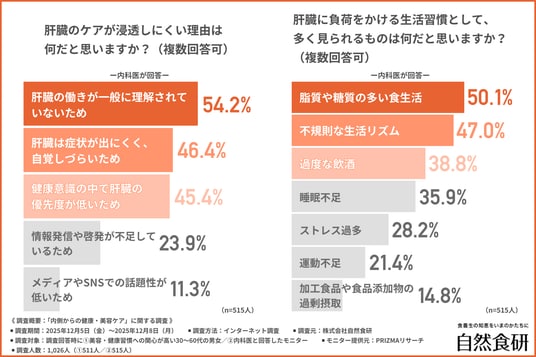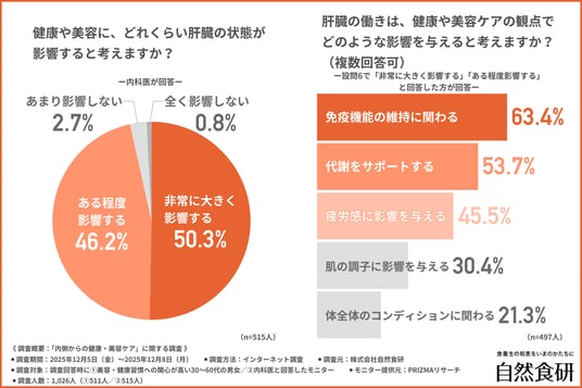 また、内科医への調査では、9割以上が「肝臓の状態は健康・美容に影響する」と回答し、特に「免疫機能の維持」や「代謝サポート」「疲労感」への影響が指摘されました。