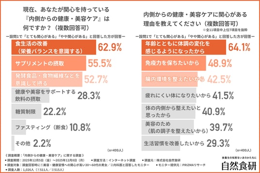株式会社自然食研(所在地:大分県豊後高田市、代表者:佐々木 興平)は、1.健康・美容習慣への関心が高い30~60代の男女/2.内科医を対象に、「内側からの健康・美容ケア」に関する調査を行いました。
