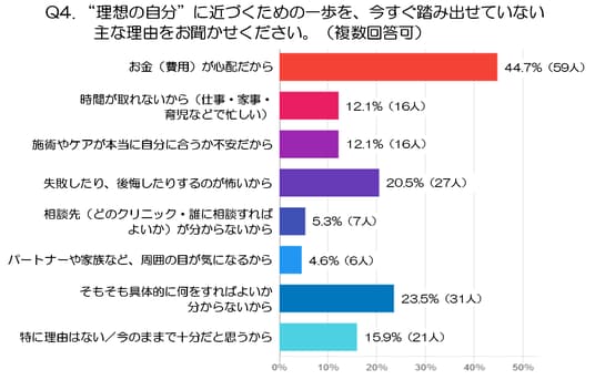 - 最も多かったのは「お金(費用)が心配だから」で44.7%(59人)でした。美容ケアや施術は明確な金額が分かりにくいことも多く、想定外の出費への不安が大きく、踏み出しづらさにつながっているといえます。