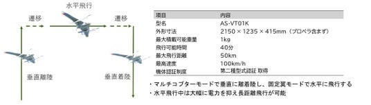 本試験で用いた機材は、VTOL型ドローンである国産ドローンのAS-VT01K(エアロセンス社製)で、機体は国土交通省の「第二種型式認証」を取得しており、目視外飛行にも申請不要となり、LTE通信による遠隔操作と、最大50kmの長距離の自動飛行が可能です。ドローンのペイロード(アイテム搭載スペース)には、固定カメラやジンバルカメラが搭載可能となっており、只見線ではジンバルカメラ、上越線では固定カメラを搭載して試験しました。また、フロントカメラの映像はリアルタイムで確認し調査を行いました。