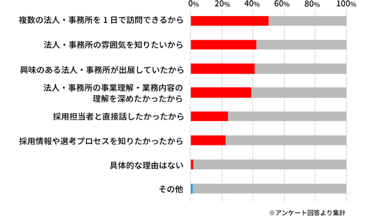 ・就職説明会への参加理由から、参加者は様々な法人・事務所について多角的に理解を深める機会として参加していることが伺える。