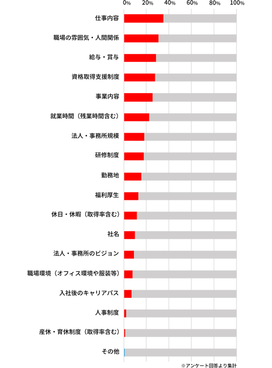 全体で最も回答が多かったのは「仕事内容」で、次いで「職場の雰囲気・人間関係」「給与・賞与」「資格取得支援制度」となった。世代別で最も多かった回答は、学生:「資格取得支援制度」、20代以下(学生除く)・30代・40代以上:「仕事内容」であった。