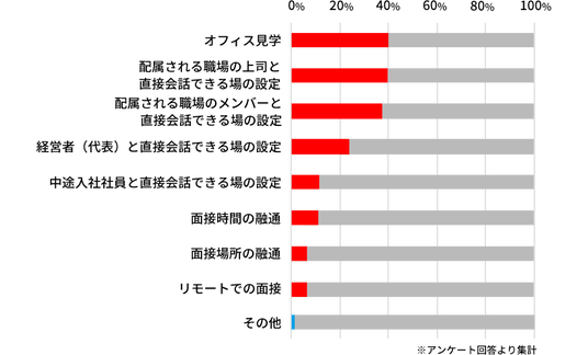 ・選考での要望は、「オフィス見学」「配属される職場の上司と直接会話できる場の設定」「配属される職場のメンバーと直接会話できる場の設定」など職場環境が分かる機会の設定が上位となった。