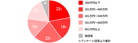 ・現年収では「300万円以下」と「401万~500万円」が最多で、希望の年収は「301万~400万円」が最多となり、前年同様に現年収を踏まえた堅実な希望年収となった。