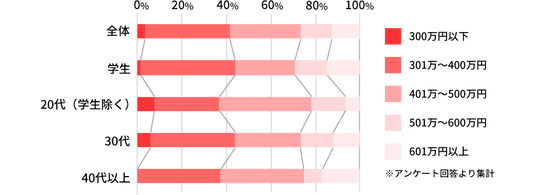 現年収:300万円以下15名、301万~400万円12名、401万~500万円15名、