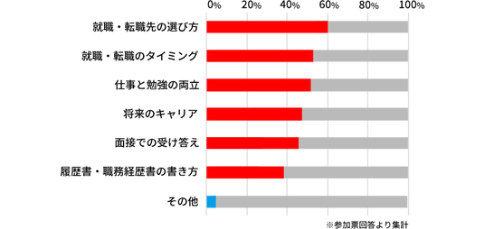 全体で回答が多かったのは「就職・転職先の選び方」である。世代別で最も多かった回答は、学生・40代以上:「就職・転職先の選び方」、20代以下(学生除く):「就職・転職のタイミング」、30代:「就職・転職先の選び方」「将来のキャリア」となった。