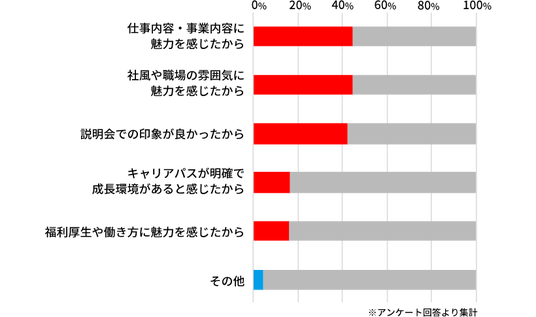 回答傾向から、参加者にとって身近な要素(就業する際の業務内容や雰囲気など)が印象に大きく影響していることが伺える。世代別で最も多かった回答は、学生:「説明会での印象が良かったから」、20代以下(学生除く):「社風や職場の雰囲気に魅力を感じたから」、30代:「仕事内容・事業内容に魅力を感じたから」「説明会での印象が良かったから」、40代以上:「仕事内容・事業内容に魅力を感じたから」となった。