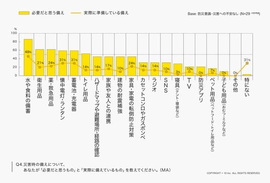 ● 一方で「トイレ用品」「寝具(テント・寝袋)」は必要性の認識は高いが、準備率は低い
