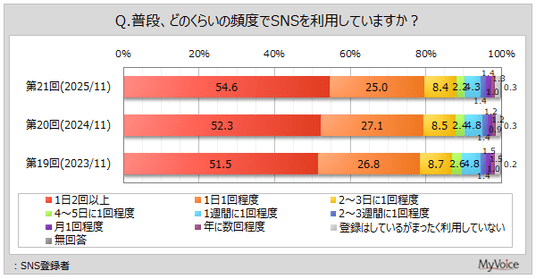 SNS登録者のうち、「1日2回以上」利用している人は54.6%です。
