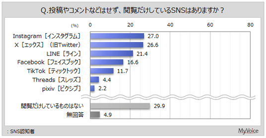 閲覧だけしているSNSは(複数回答)、「Instagram」「X」「LINE」が各20%台です。