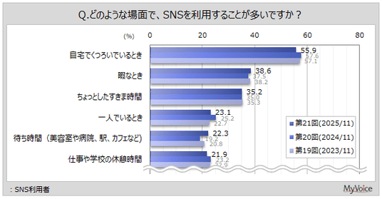 SNS利用者に、どのような場面でSNSを利用することが多いかを聞いたところ(複数回答)、「自宅でくつろいでいるとき」が55.9%、「暇なとき」「ちょっとしたすきま時間」が各30%台です。