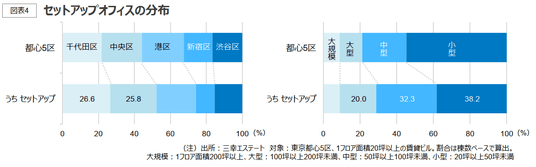 セットアップオフィスの供給は通常オフィスに比べて、エリア別では千代田区や中央区で、規模別では1フロア面積50~200坪の中型・大型ビルで多い傾向にある。100坪以下の面積帯での募集区画が多いものの、最近では数百坪クラスのセットアップ区画を計画するビルオーナーも現れている。1フロア面積200坪以上の大規模ビルにおいても分割区画でセットアップオフィスを導入する事例は増加している。