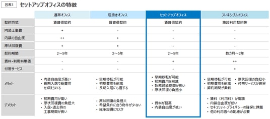 従前はオフィスを比較的短期間で移転するベンチャー企業等がセットアップオフィスのメインの需要層であったが、建築工事費の高騰と工事期間の長期化を背景に、早期での入居やイニシャルコストの削減を希望するテナント等へも需要層は広がっている。ビルオーナーにとって、セットアップオフィスは賃料単価を引き上げることができ、収益性および資産価値の向上が期待される。工事費高騰の収まる見込みが薄い状況下では、セットアップオフィスはテナントとビルオーナーの双方にとって魅力的な選択肢となり、需要と供給双方の拡大が見込まれる。特に中小規模のビルでは、セットアップオフィスが一般的な選択肢として定着していくと考えられる。